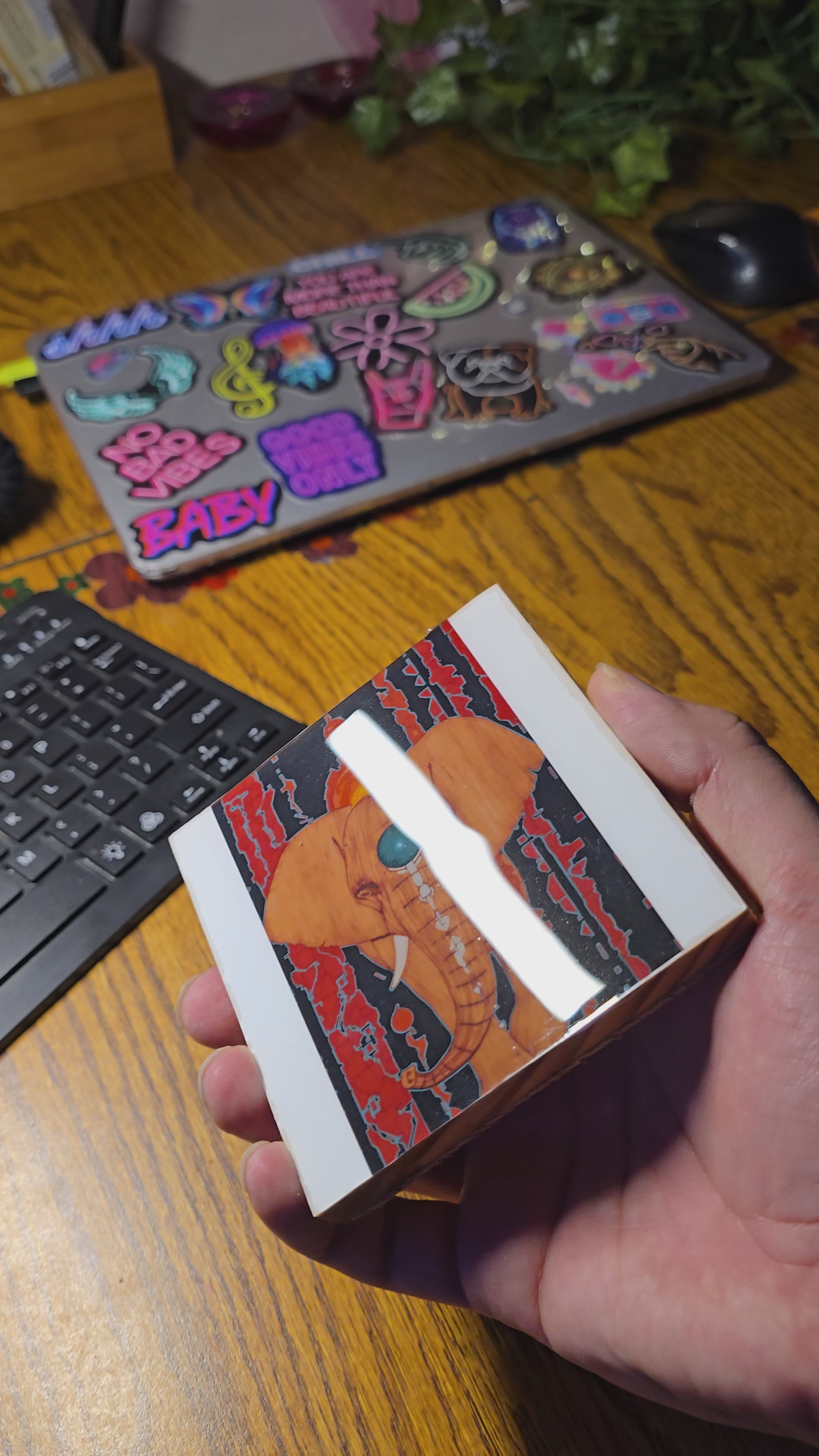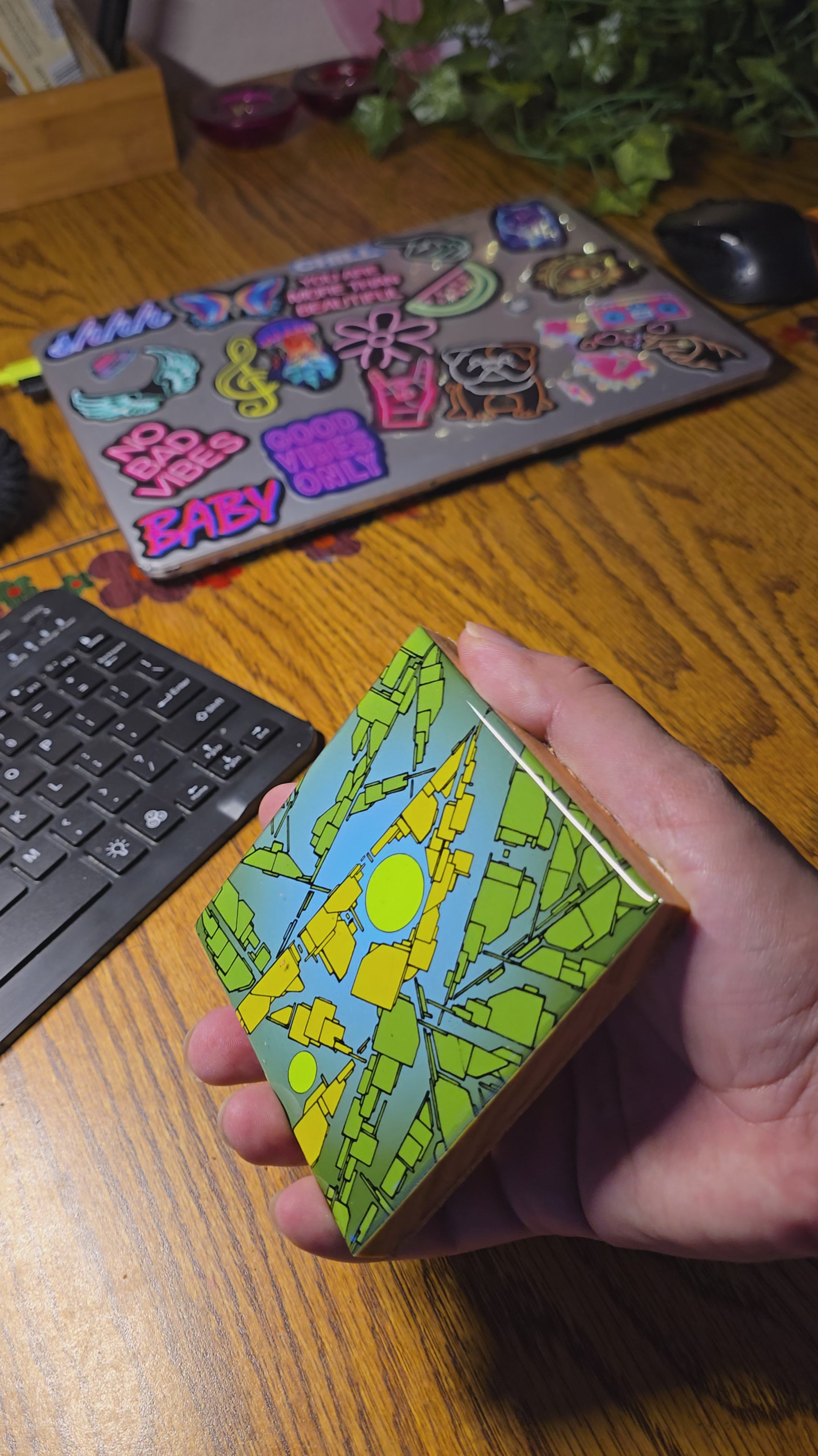 I am pleased to announce the release of two new coaster designs, and I have also reintroduced two popular designs that my customers have particularly enjoyed. The two new additions are "Energy Flow" and "Wisdom." "Energy Flow" showcases a dark blue topographic background with vibrant energy flowing in the foreground, culminating in a yellow glow at its center. "Wisdom" features an elegant elephant, and this design is a print of my original artwork. The two returning designs are "Mind Expansion" and "Hortons Creek." "Mind Expansion" is a striking black design featuring a man's face composed of my unique pattern-breaking design, set against a backdrop of outer space. "Hortons Creek" is a verdant green design, with its color palette inspired by my personal photography from Hortons Creek.